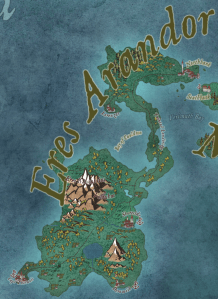 A lengthy continent shared by Humans and Dwarves. Split between two divided Human nations of the North and South, it contains several favorable shores for seafaring cities and a large mountainous region wherein the kingdom of mining Dwarves extract the world’s most valuable ores. At one time there existed a single ‘Arandor’ nation, but disagreements over their relationship to their Dwarven neighbors fractured their one-time unity.